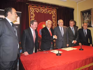 El presidente del Consejo de Cofradías de Sevilla, Carlos Bourrellier, y el presidente de la Fundación Sevillana Endesa, Antonio Pascual, han suscrito este lunes un acuerdo de colaboración para iluminar el exterior e interior de la Capilla de Santa María de Jesús, ubicada en Puerta de Jerez y sede del citado Consejo.