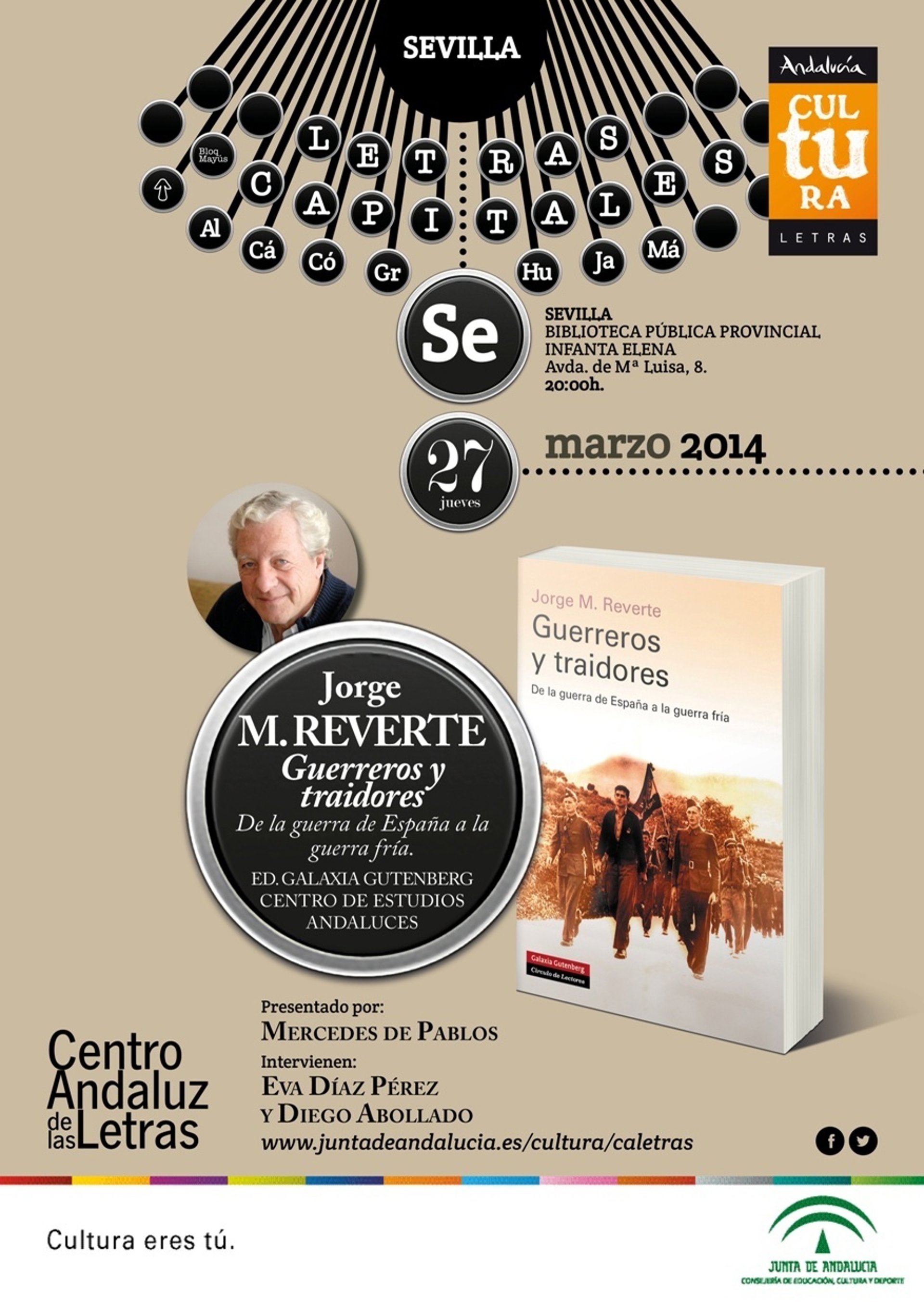 El Centro de Estudios Andaluces y el Centro Andaluz de las Letras organizan, en el marco del ciclo Letras Capitales, la presentación el último libro de Jorge Martínez Reverte 'Guerreros y traidores. De la guerra de España a la guerra fría', editado por Galaxia Gutenberg y el propio Centro de Estudios Andaluces. La Biblioteca Pública Provincial Infanta Elena acoge este jueves 27 de marzo la presentación del libro a las 20,00 horas. Junto a Jorge M. Reverte, asistirán la directora del Centro de Estudios Andaluces, Mercedes de Pablos, y los periodistas Diego Abollado y Eva Díaz Pérez.