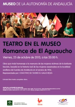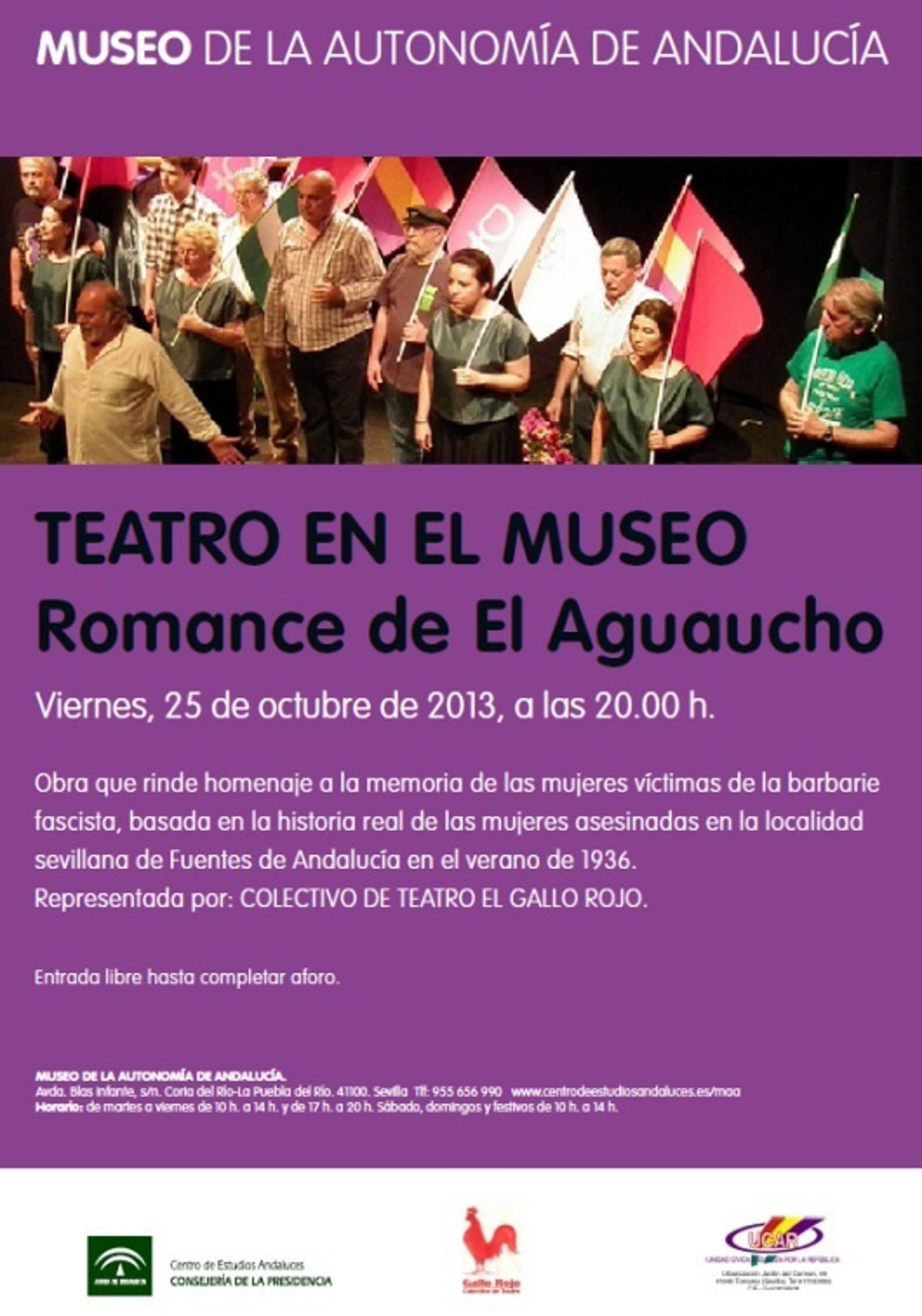 El Museo de la Autonomía de Andalucía acoge este viernes a las 20,00 horas la obra de teatro 'Romance de El Aguaucho', representada por el grupo de teatro El Gallo Rojo. Se trata de un proyecto surgido entre los miembros de este colectivo para homenajear a las mujeres del municipio sevillano de Fuentes de Andalucía que fueron vejadas y asesinadas en 1936 en la finca El Aguaucho, a medio camino entre este pueblo y la localidad vecina de La Campana.
