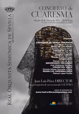 En colaboración con la Diputación Provincial de Sevilla y el propio Teatro Riberas del Guadaíra, la ROSS lleva su ya tradicional concierto de Cuaresma al escenario del Auditorio alcalareño con un programa que incluye marchas, tan conocidas y aclamadas, como Esperanza de Triana Coronada, Nuestro Padre Jesús de las Penas, Virgen de la Paz, Corpus Christi, Amarguras, Aniversario Macareno, Virgen del Valle y Pasan los campanilleros, entre otras, bajo la dirección del maestro Juan Luis Pérez.