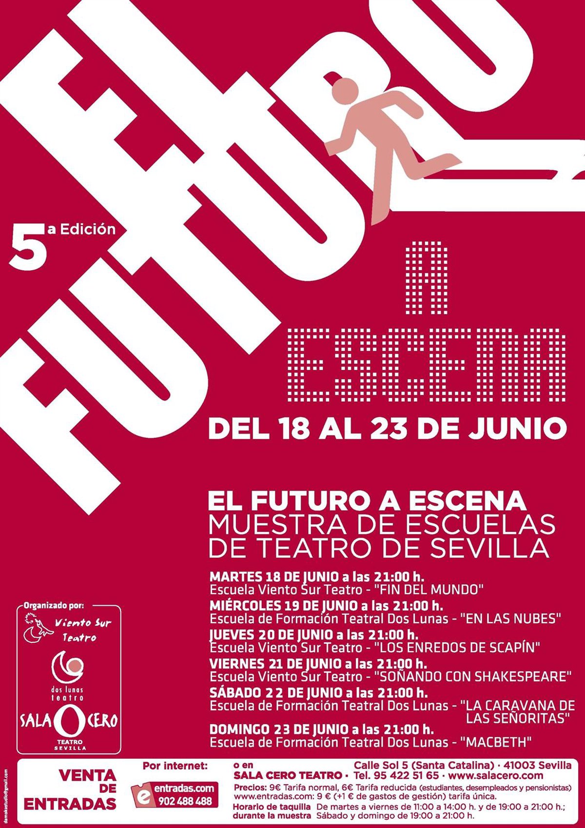 La quinta edición del Festival 'Futuro a escena', Muestra de Escuelas de Teatro de Sevilla, tendrá lugar desde este martes 18 al 23 de junio en Sala Cero, espacio que un año más se convierte en escaparate de nuevas promesas procedentes de las escuelas Viento Sur Teatro y Dos Lunas Teatro.