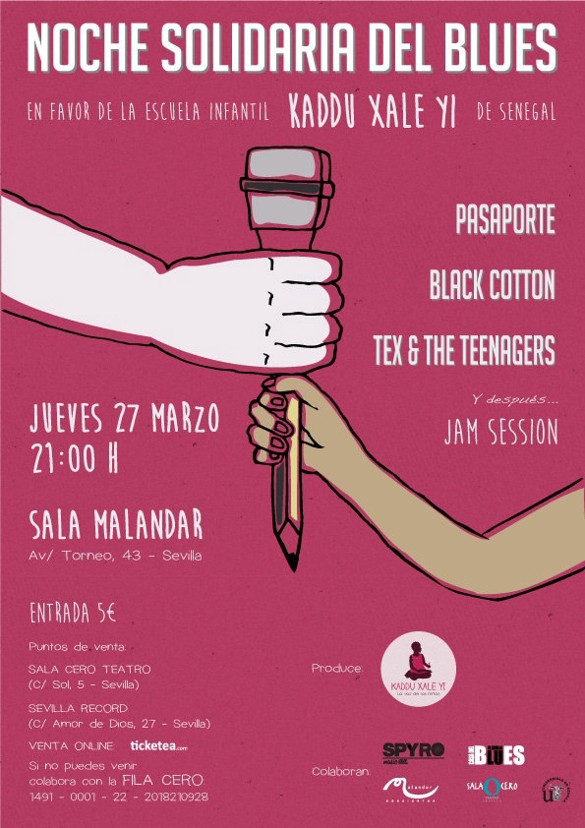 Pasaporte, Tex and The Teenagers y Black Cotton componen el cartel del concierto solidario que se celebrará el próximo jueves 27 de marzo, a partir de las 21,00 horas, en la Sala Malandar, cuya íntegra recaudación irá destinada a la ONG sevillana Kaddu Xale Yi - La voz de los niños. Como colofón, la noche acabará con una Jam Session, toda una fiesta improvisada, dando cita a músicos de la ciudad que unirán sus voces a esta causa solidaria.
