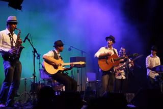 Por último, 'Jazz de Marras' se ha presentado como un "grupo de "swing" versátil, fresco y bailongo que mezcla el gusto por el "jazz manouche" con las dispares influencias personales de cada uno de sus miembros" y ha interpretado los temas de 'Mesa para cuatro', disco que vio la luz hace más de una año y que ha servido para consolidar el estilo del grupo caracterizado por marcadas reminiscencias al sonido clásico del "jazz" gitano, junto con otros cortes que coquetean con el "swing" americano, la música balcánica, o incluso el flamenco.
