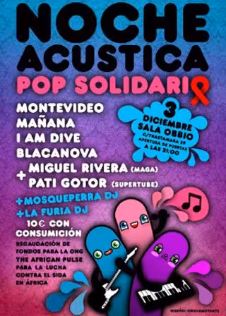 La Sala Obbio de Sevilla acogerá este viernes 3 de diciembre un concierto solidario a beneficio de la ONG The African Pulse --con motivo de la celebración el 1 de diciembre del Día Mundial de la Lucha contra el Sida-- y que estará protagonizado por cinco de las bandas "más punteras" de Sevilla como son Miguel Rivera (Maga) junto a Pati Gotor, Montevideo, I'm dive, Mañana y Blacanova.