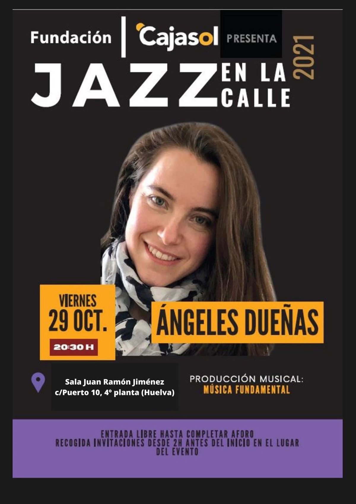 La Fundación Cajasol, debido a que las previsiones atmosféricas pronostican lluvia, ha trasladado el último concierto de su Ciclo de Jazz a la Sala Juan Ramón Jiménez, situada en la calle Puerto. El concierto de Angeles Dueñas Trío, que cerrará este ciclo, tendrá lugar este viernes 29 a las 20,30 horas.