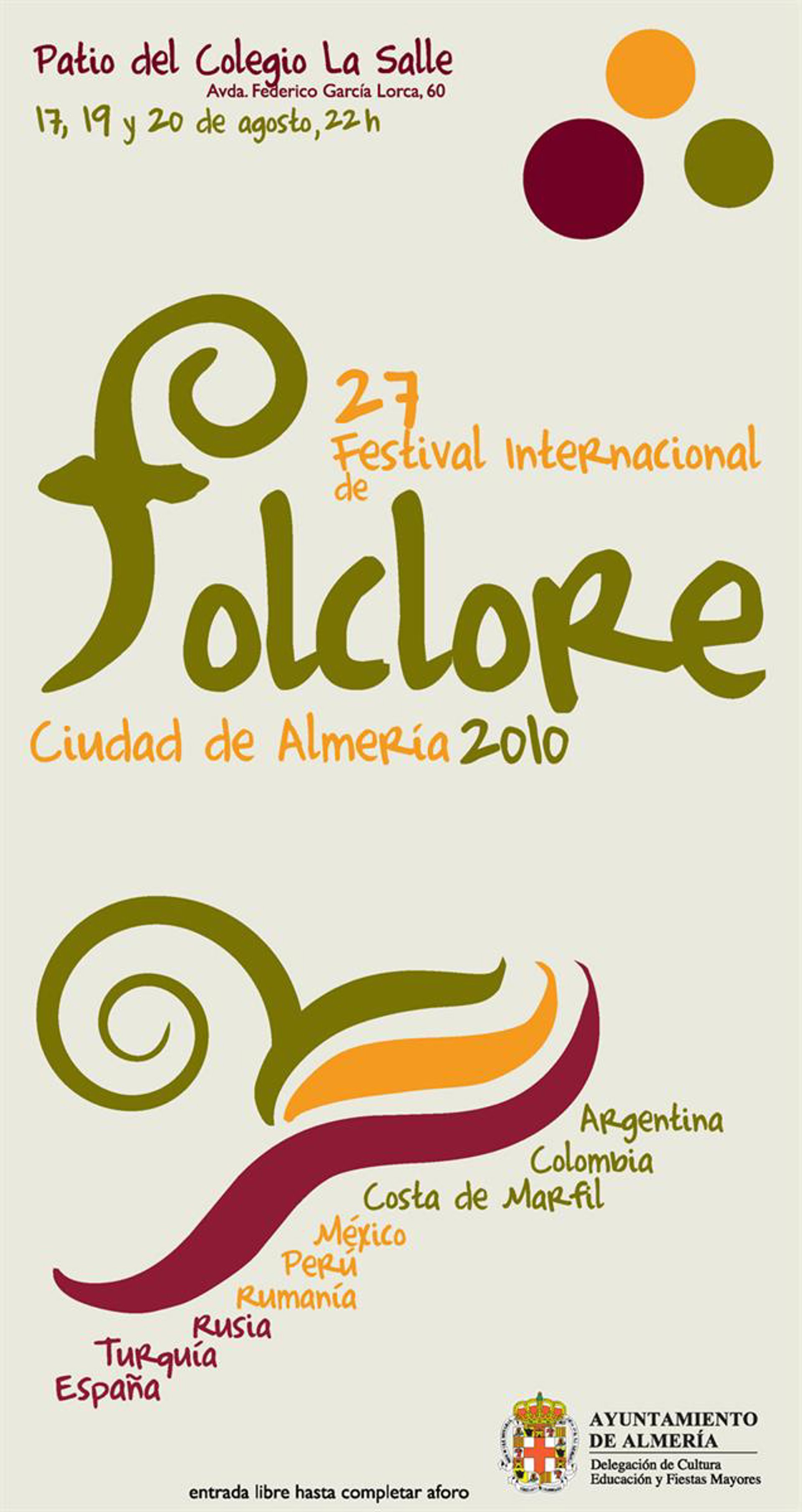 El Festival Internacional de Folclore 'Ciudad de Almería' acoge desde este martes hasta el próximo día 20 en el patio del colegio 'La Salle' de la capital las actuaciones de distintos grupos procedentes de nueve países entre los que están España, Perú, Rusia, Argentina, México, Colombia, Turquía, Costa de Marfil y Rumanía.