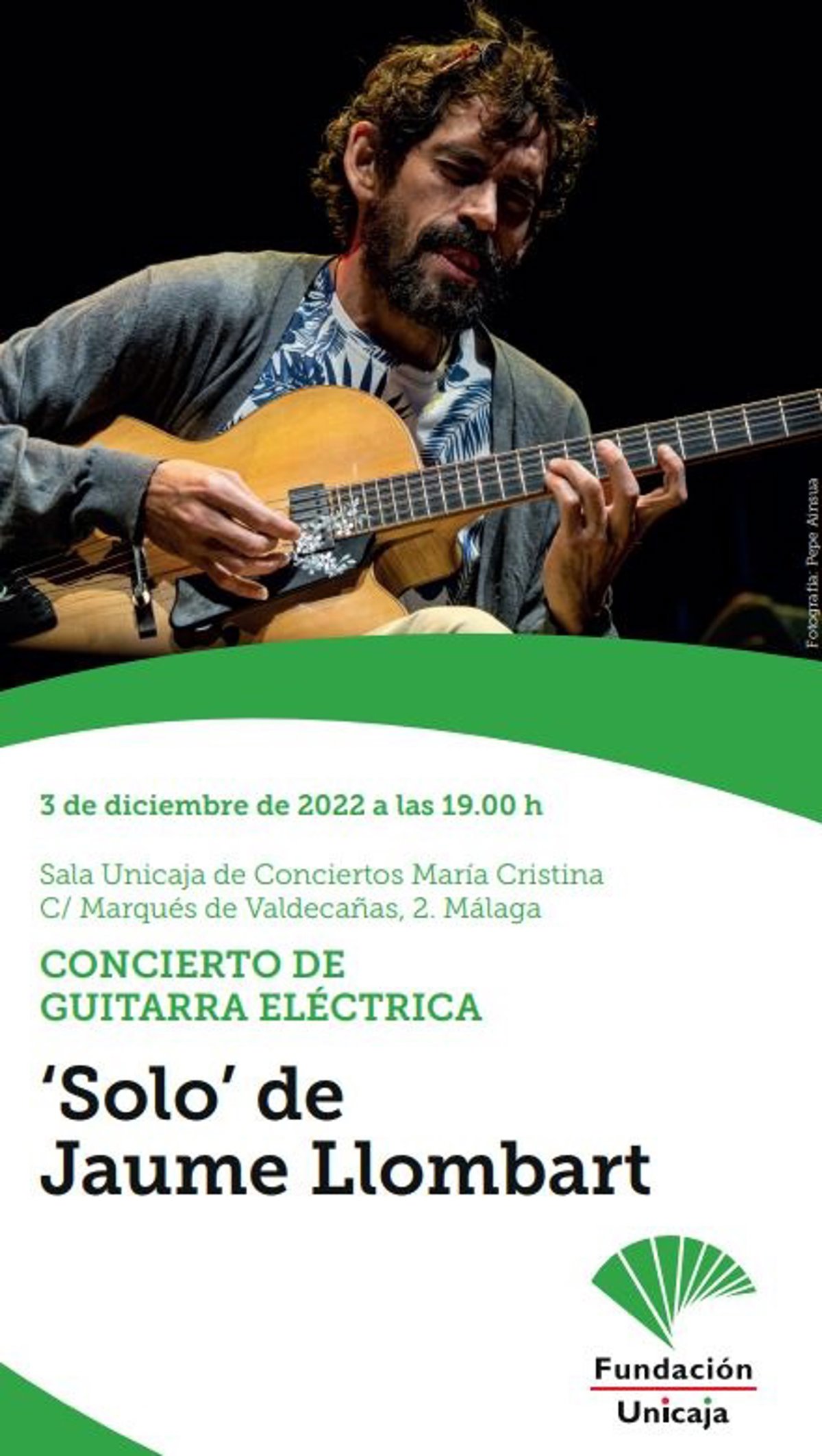 La Sala Unicaja de Conciertos María Cristina de la Fundación Unicaja acoge un recital de guitarra del artista Jaume Llombart, que tendrá lugar mañana sábado 3 de diciembre a las 19.00 horas.