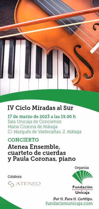 La Sala Unicaja de Conciertos María Cristina acoge una nueva cita musical del ciclo 'Miradas al Sur' de la Fundación Unicaja con el concierto de Paula Coronas y el cuarteto de cuerda Atenea Ensemble el próximo viernes 17 de marzo a las 19.00 horas con entrada libre hasta completar aforo.