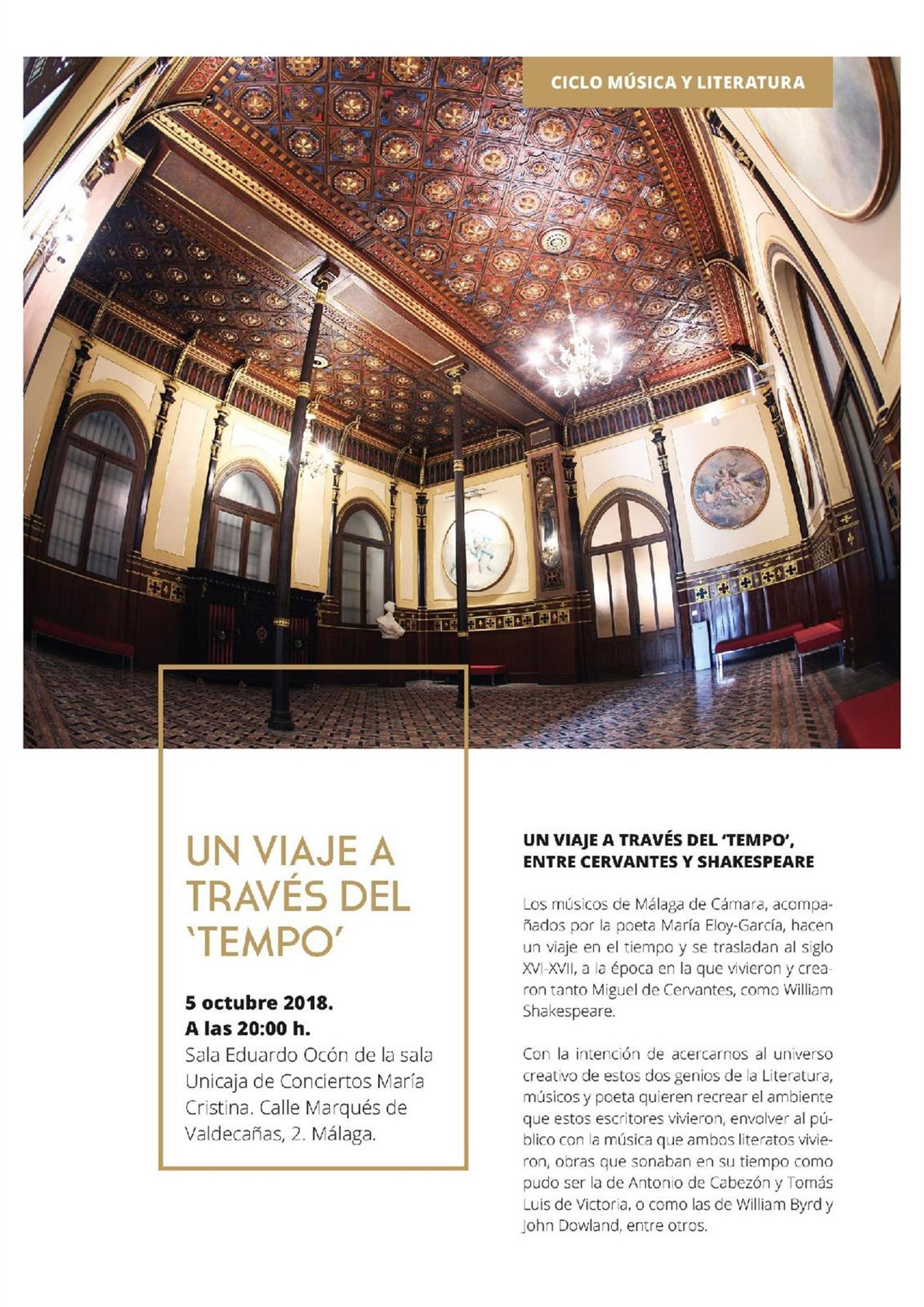 'Viaje a través del 'Tempo'. Entre Cervantes y Shakespeare' tiene la finalidad de acercar a los asistentes el universo creativo de estos dos genios de la Literatura. Para ello, Eloy-García y Málaga de Cámara recrearán el ambiente en el que vivían ambos autores interpretando fragmentos de literatos a los que leían Cervantes y Shakespeare y ejecutando piezas musicales que escuchaban en las fiestas de los siglos XVI y XVII, sin olvidar la propia obra de los protagonistas.