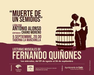 Así, Antonio Alonso, chirigotero de los Guatifó, leerá el relato 'Muerte de un semidios', incluido en el libro Cinco historias del vino, que Quiñones publicó por primera vez en 1960. En esta ocasión, la música sonará desde el contrabajo de Chano Moreno. En el cartel, de color uva, se puede ver a un hombre apoyado cansadamente en un barril de vino.