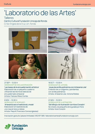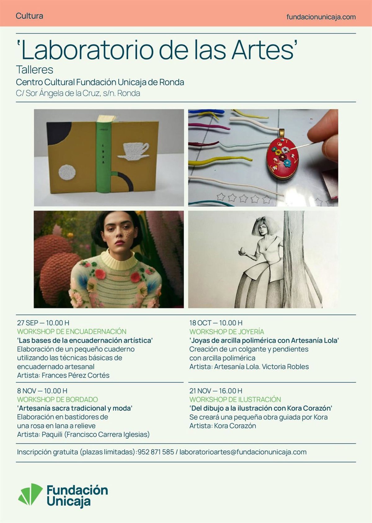Los talleres tendrán lugar durante los meses de septiembre a noviembre en el Centro Cultural Fundación Unicaja de Ronda previa inscripción gratuita a través del correo electrónico laboratorioartes@fundacionunicaja.com o el teléfono 952871585.