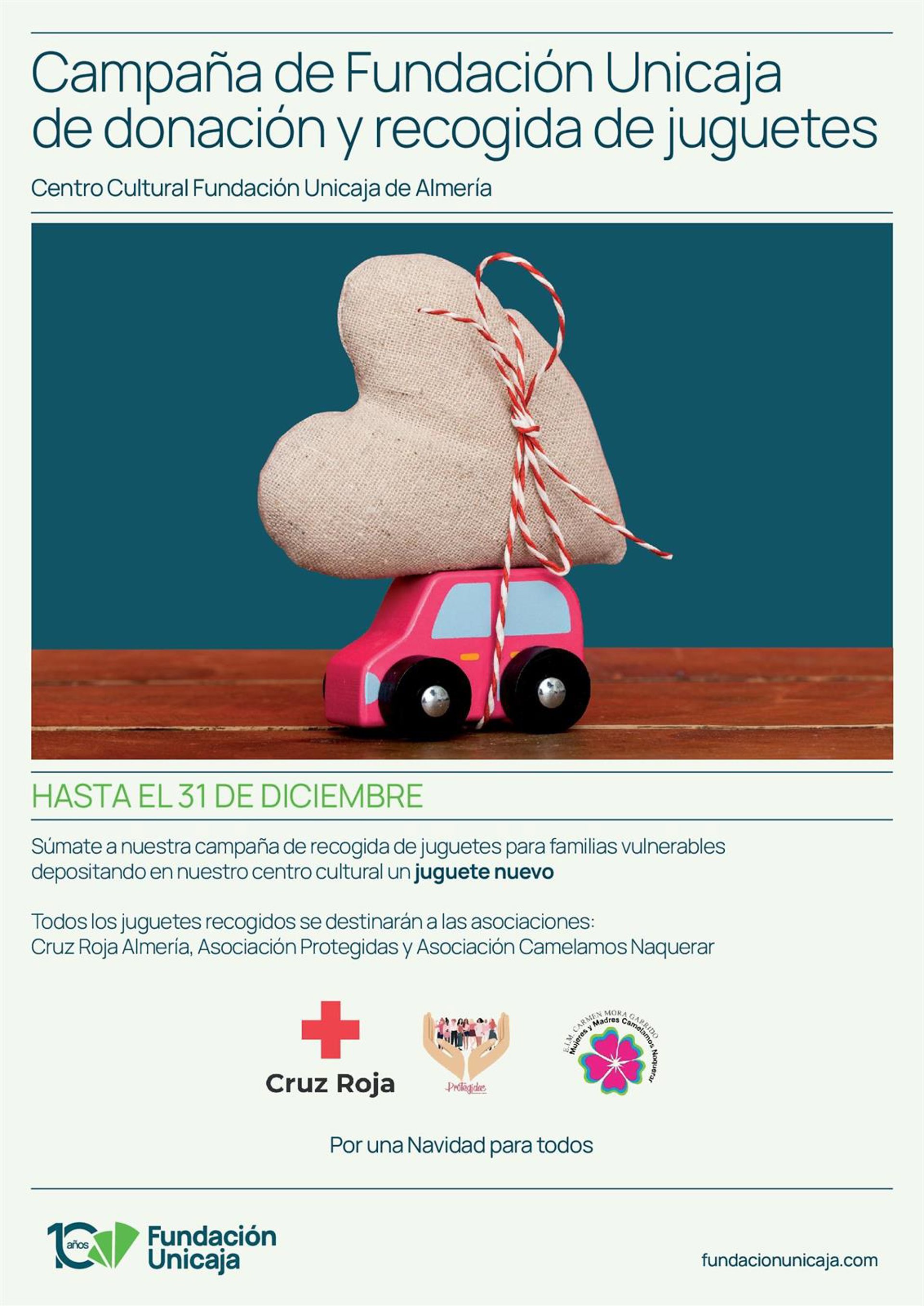 La Fundación Unicaja ha lanzado una campaña de recogida de juguetes para menores de familias vulnerables a beneficio de Cruz Roja y las asociaciones Protegidas y Camelamos Naquerar, que se desarrollará hasta el 31 de diciembre en el Centro Cultural Fundación Unicaja de Almería.