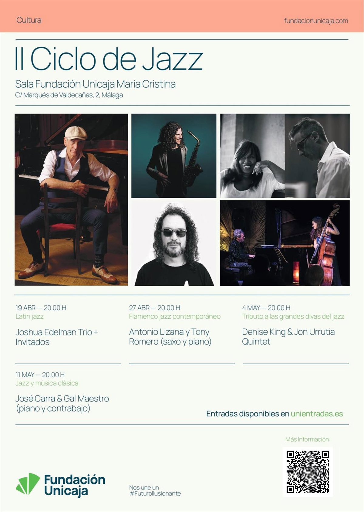 El jazz vuelve a sonar en la Sala Fundación Unicaja María Cristina con las actuaciones de Joshua Edelman Trío, Antonio Lizana y Tony Romero, Denise King y Jon Urrutia Quintet y José Carra y Gal Maestro. Las entradas para el ciclo, que arrancará el próximo 19 de abril, ya se pueden adquirir en www.unientradas.es. Todos los conciertos comenzarán a las 20.00 horas.