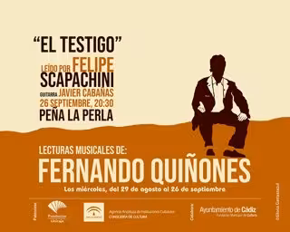 Según informa la Junta en una nota, en las anteriores sesiones, una voz, la del cantaor Felipe Scapachini en esta quinta cita, leerá un relato de Quiñones, acompañado de un instrumento musical. Así la guitarra y las manos de Javier Cabañas pondrán fin a este original ciclo. El relato será 'El testigo', incluido en 'El libro de los andaluces', de 1980.