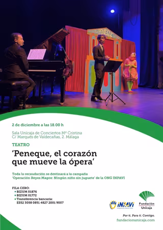 Fundación Unicaja organiza una jornada familiar y solidaria con la representación teatral infantil 'Peneque, el corazón que mueve la ópera' de la Compañía Miguel Pino, cuya recaudación de la venta de entradas irá destinada a la campaña 'Operación Reyes Magos: Ningún niño sin juguete' de la ONG Integración Para la Vida en Málaga (Inpavi Málaga).