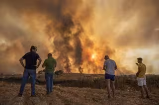 Vecinos observan el incendio forestal declarado en el Paraje Olivargas de Almonaster la Real (Huelva, Andalucía, España), a 27 de agosto de 2020. - A. Pérez - Europa Press