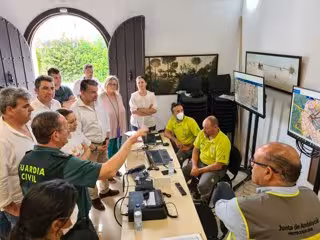 El viceconsejero de la Presidencia, Administración Pública e Interior de la Junta de Andalucía, Antonio Sanz, junto al delegado del Gobierno andaluz en Huelva, en funciones, Álvaro Burgos, y la alcaldesa de Almonte, Rocío del Mar Castellano, junto con Macarena Robles, cuarta Teniente de Alcalde y Concejal-Delegada de la Aldea de El Rocío, han acudido a primera hora de la mañana al PMA para comprobar de primera mano que todo estaba a punto. "Este Puesto de Mando, con representación de todas las administraciones es un ejemplo de cooperación y coordinación del que nos sentimos orgullosos y satisfechos", ha señalado Sanz.