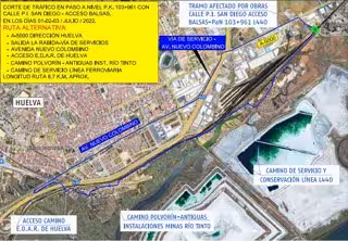 Para ello se establece como ruta alternativa la siguiente: Carretera A-5000 (dirección Huelva), avenida Nuevo Colombino, camino acceso Edar de Huelva, camino polvorín - antiguas instalaciones de Río Tinto, camino de servicio línea ferroviaria.