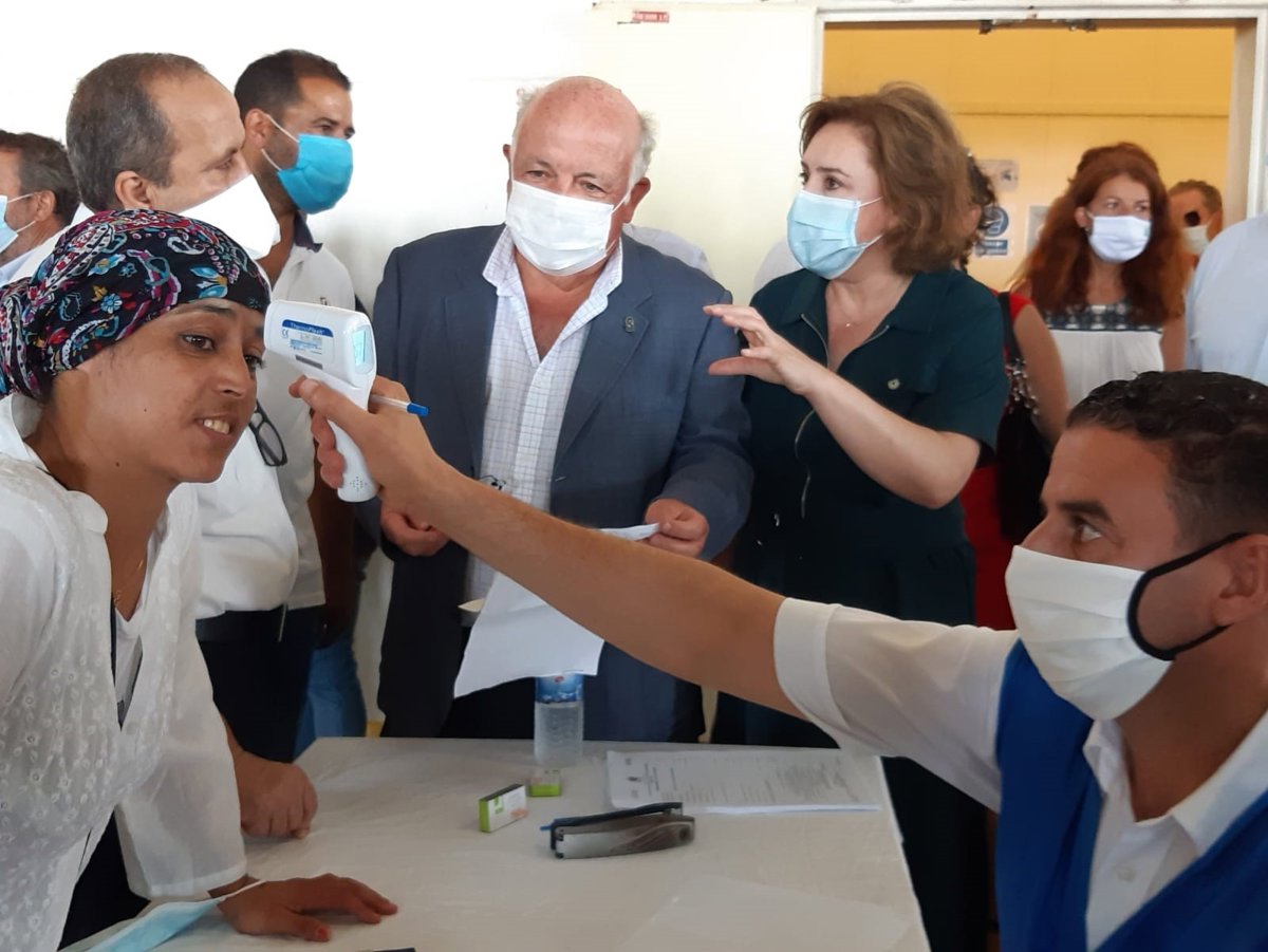 El consejero de Salud, Jesús Aguirre, juntao a la delegada del Gobierno, Sandra García, en la despedida a las últimas temporeras marroquíes que han partido este marte desde Huelva. - JUNTA DE ANDALUCÍA