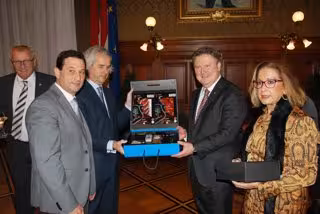 La Diputación de Huelva ha hecho entrega a Michael Ludwig de un maletín con productos gourmet de la provincia, mientras que el Ayuntamiento de Punta Umbría ha ofrecido un obsequio con distintas imágenes de la localidad costera.