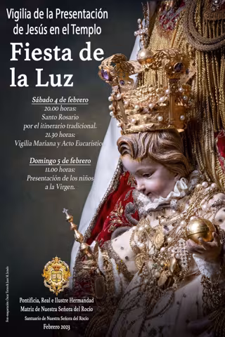 De este modo, el sábado, a las 20,00 horas, tendrá lugar el rezo del Rosario por el itinerario tradicional, en las calles de la aldea, que estará presidido por el simpecado de la institución almonteña, y el acompañamiento de la Escuela de Tamborileros . A continuación, a las 21,30 horas, se celebrará en el Santuario la Vigilia Mariana, uno de los momentos de mayor recogimiento en los que, con el templo prácticamente a oscuras, se bendice el fuego y se alzan las velas, como símbolo de que Jesús es la Luz que viene a alumbrarnos.