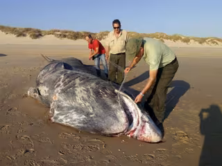 Un tiburón peregrino (Cetorhinus maximus) de unos nueve metros de longitud ha aparecido muerto en la playa de Doñana, a la altura de Torre Carbonero.