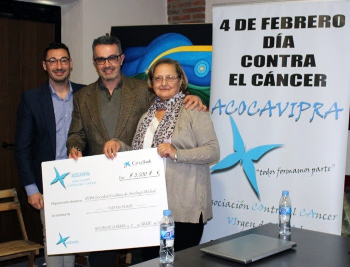 La Asociación Contra el Cáncer Virgen del Prado (Acocavipra) de Higuera de la Sierra (Huelva) ha realizado una aportación económica de 3.000 euros a la Sociedad Andaluza de Oncología Médica (SAOM) con el objetivo de "contribuir al desarrollo de las actividades que lleva a cabo esta sociedad, de manera especial para el fomento de la investigación sobre el cáncer y a la mejora de la calidad profesional y asistencial que la oncología médica ofrece a los pacientes con esta enfermedad en la comunidad andaluza".