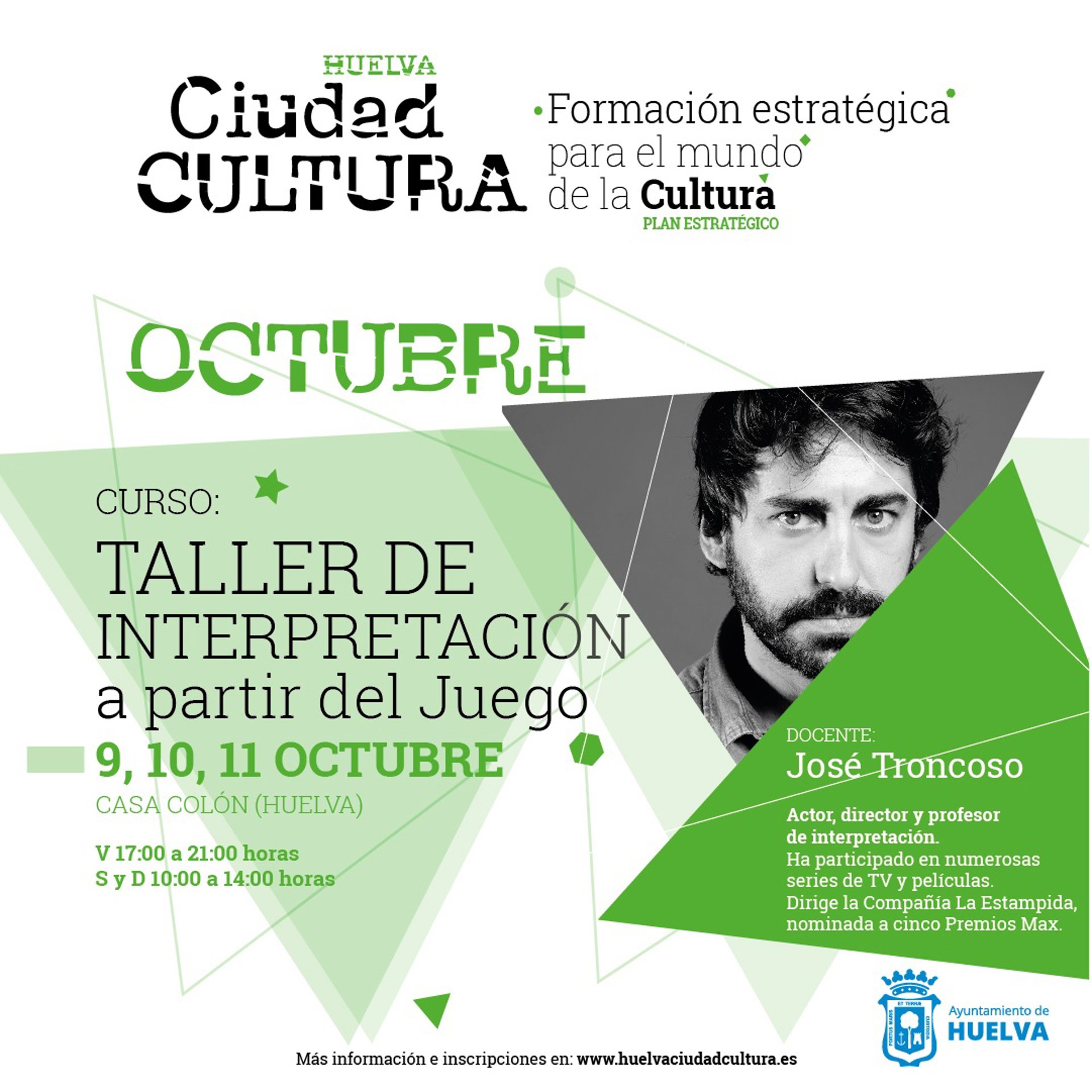 La Concejalía de Cultura del Ayuntamiento de Huelva abre este lunes la inscripción 'on line' al Taller de Interpretación a través del Juego, que se impartirá del 9 al 11 de octubre en la Casa Colón por el director, actor y profesor José Troncoso. Una iniciativa enmarcada en el nuevo programa municipal 'Huelva Ciudad Cultura', encaminada a cubrir las necesidades de formación cultural en diferentes disciplinas artísticas.