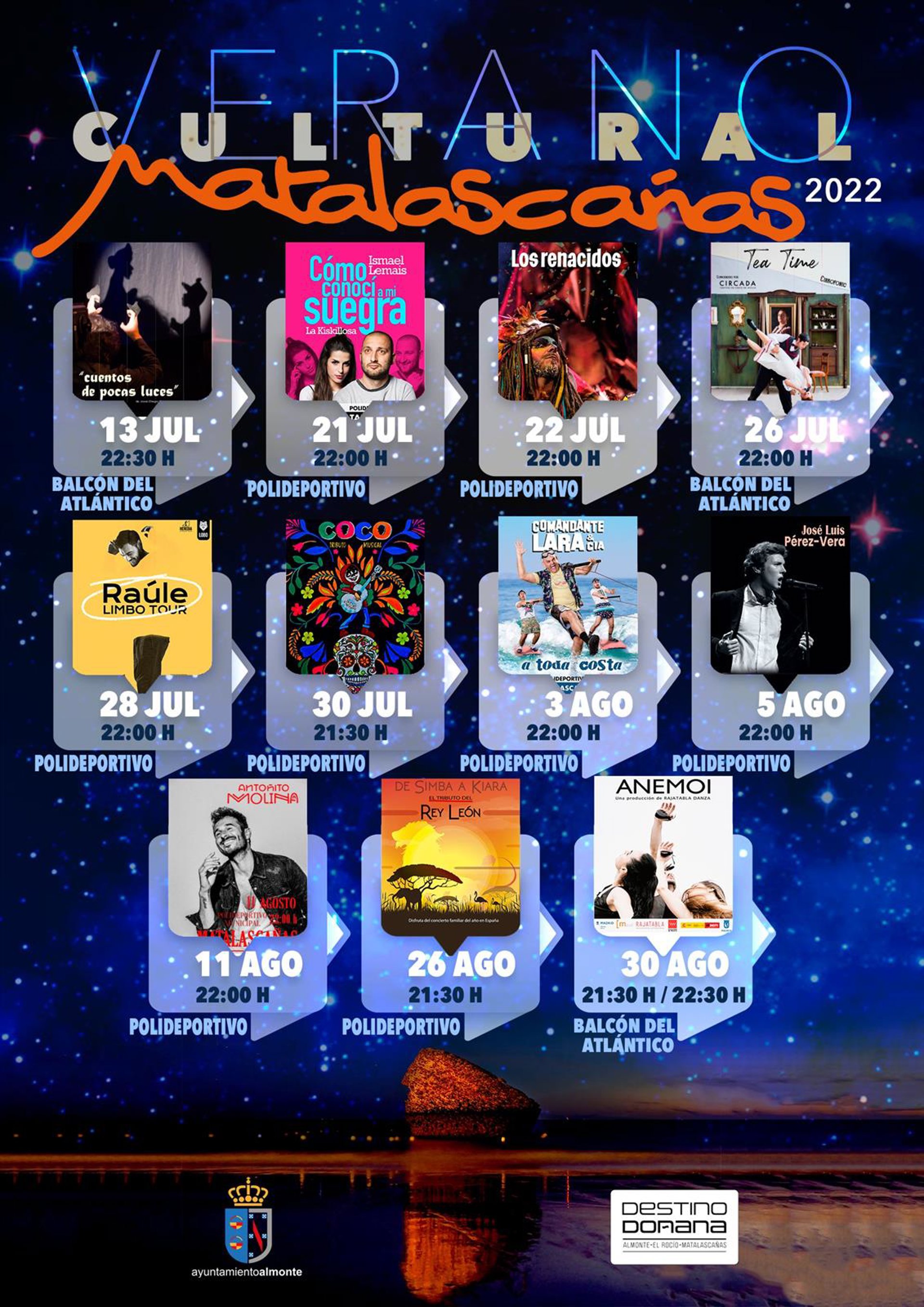 Por su parte, en Matalascañas el humor, los musicales y los conciertos se dan la mano para dar forma a un cartel que traerá hasta el núcleo costero a rostros tan conocidos como los humoristas Ismael Lemais (21 de julio) y el Comandante Lara (3 de agosto), los cantantes Raúle (28 de julio), José Luis Pérez-Vera (5 de agosto) y Antoñito Molina (11 de agosto), los musicales de Coco (30 de julio) y El Rey León (26 de agosto) y los sones de carnaval de Los Renacidos (el 22 de julio).