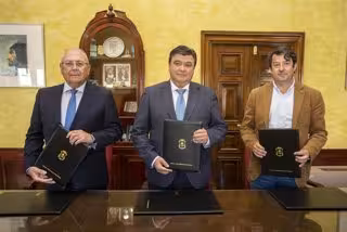 El alcalde de Huelva, Gabriel Cruz, ha suscrito este miércoles un convenio de colaboración con el director general de la Fundación Atlantic Copper, Antonio de la Vega, y con el presidente de Asprodesordos, Alonso Jesús Rubio, que permitirá garantizar la accesibilidad auditiva en el Gran Teatro, gracias a la instalación de un novedoso sistema denominado 'bucle magnético'.