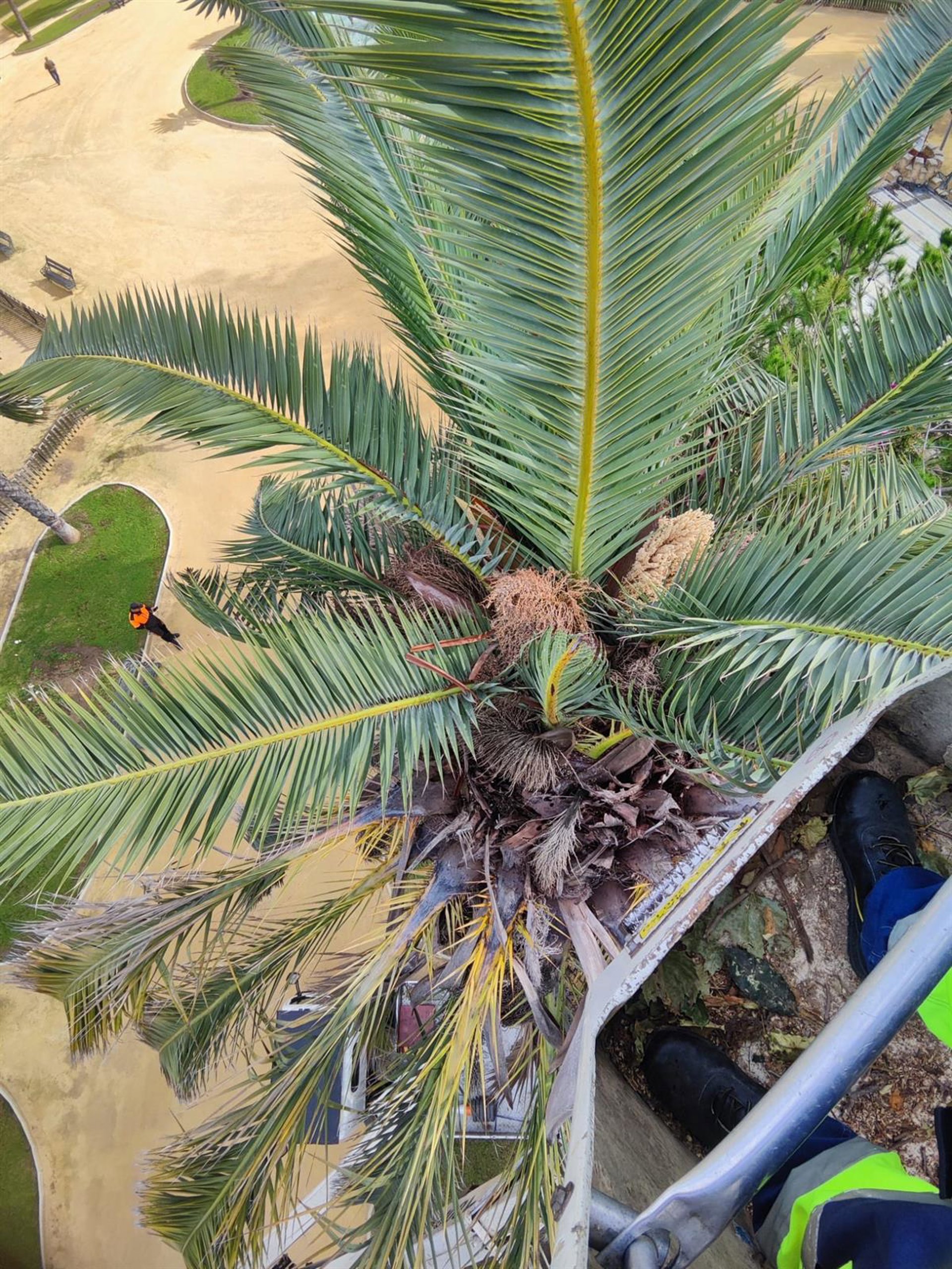 Para ello, en los ejemplares afectados, el Ayuntamiento de Huelva aplica tratamientos de choque centrados en duchas foliares y en los casos más graves, a modo de paliativos, una cirugía que consiste en eliminar las hojas en mal estado, respetando las verdes, limpiando el denominado 'ojo' de la palmera para favorecer el crecimiento de las hojas centrales.
