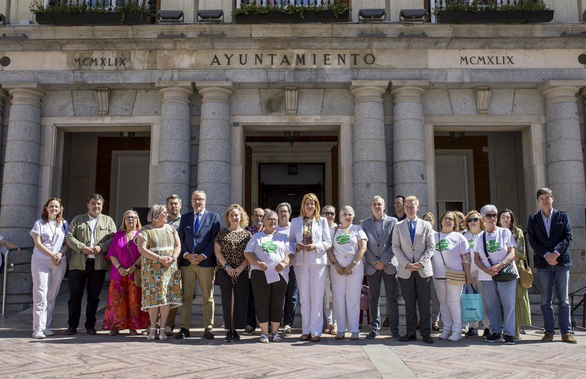 Foto de familia del acto celebrado a las puertas del Ayuntamiento, con la alcaldesa Pilar Miranda en el centro. - ALBERTO DÍAZ