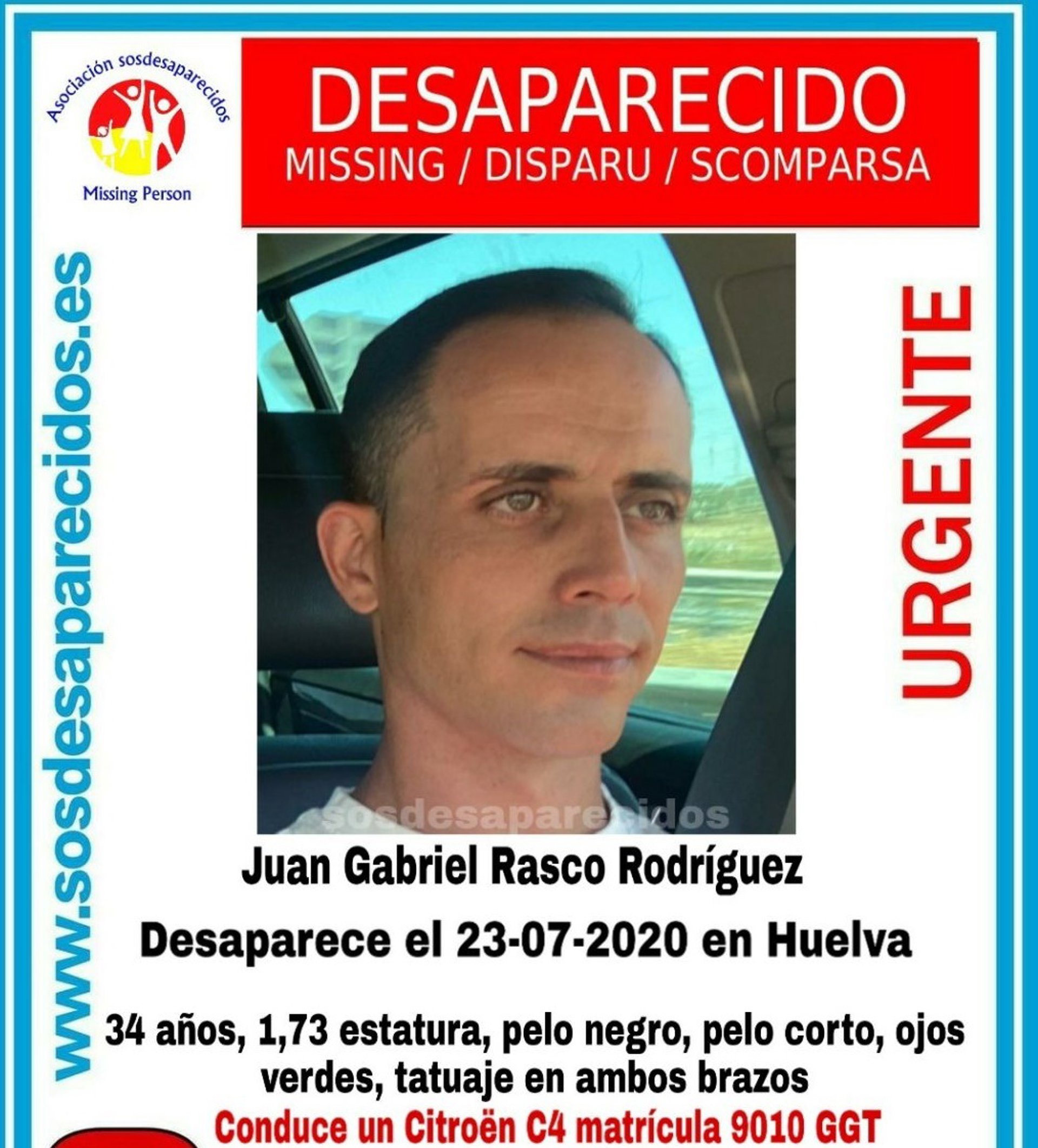 Juan Gabriel Rasco Rodríguez mide 1,73 metros, tiene pelo negro corto, ojos verdes y tatuajes en ambos brazos. Su familia ha pedido que si alguien sabe algo de su paradero, se ponga en contacto con el servicio de Emergencias 112 Andalucía.