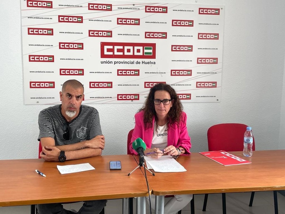 Archivo - La secretaria general de CCOO Huelva, Julia Perea, y del secretario de organización de la federación del Hábitat Huelva, Gerardo Fernández, en rueda de prensa. - CCOO HUELVA - Archivo