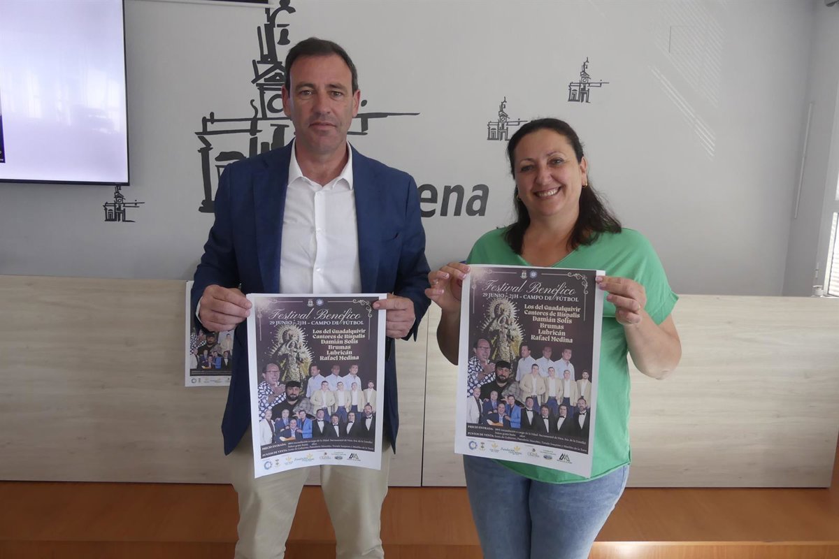 El alcalde de Chucena (Huelva), Antonio Manuel Rubio, y la hermana mayor de la Hermandad de la Virgen de la Estrella, Estrella Rocío de la Torre, han presentado este lunes el cartel del Festival Benéfico a favor de esta entidad que se celebrará el próximo sábado 29 de junio en campo de fútbol de la localidad.