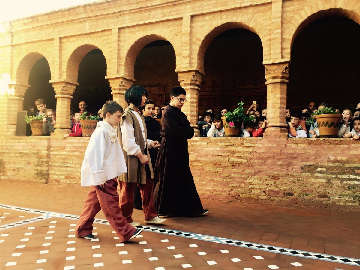La representación comienza con la narración del actual prior del Monasterio de La Rábida, Francisco García, que contribuye a la contextualización histórica y que facilita el viaje en el tiempo. Como espectadores, cientos de niños, que han acudido desde varios colegios, tanto de la provincia de Huelva, --como el colegio Menéndez y Pelayo de Valverde del Camino--, como de la provincia de Sevilla, con un colegio de Umbrete. La sesión de la tarde ha tenido como público a los vecinos del barrio de La Orden.