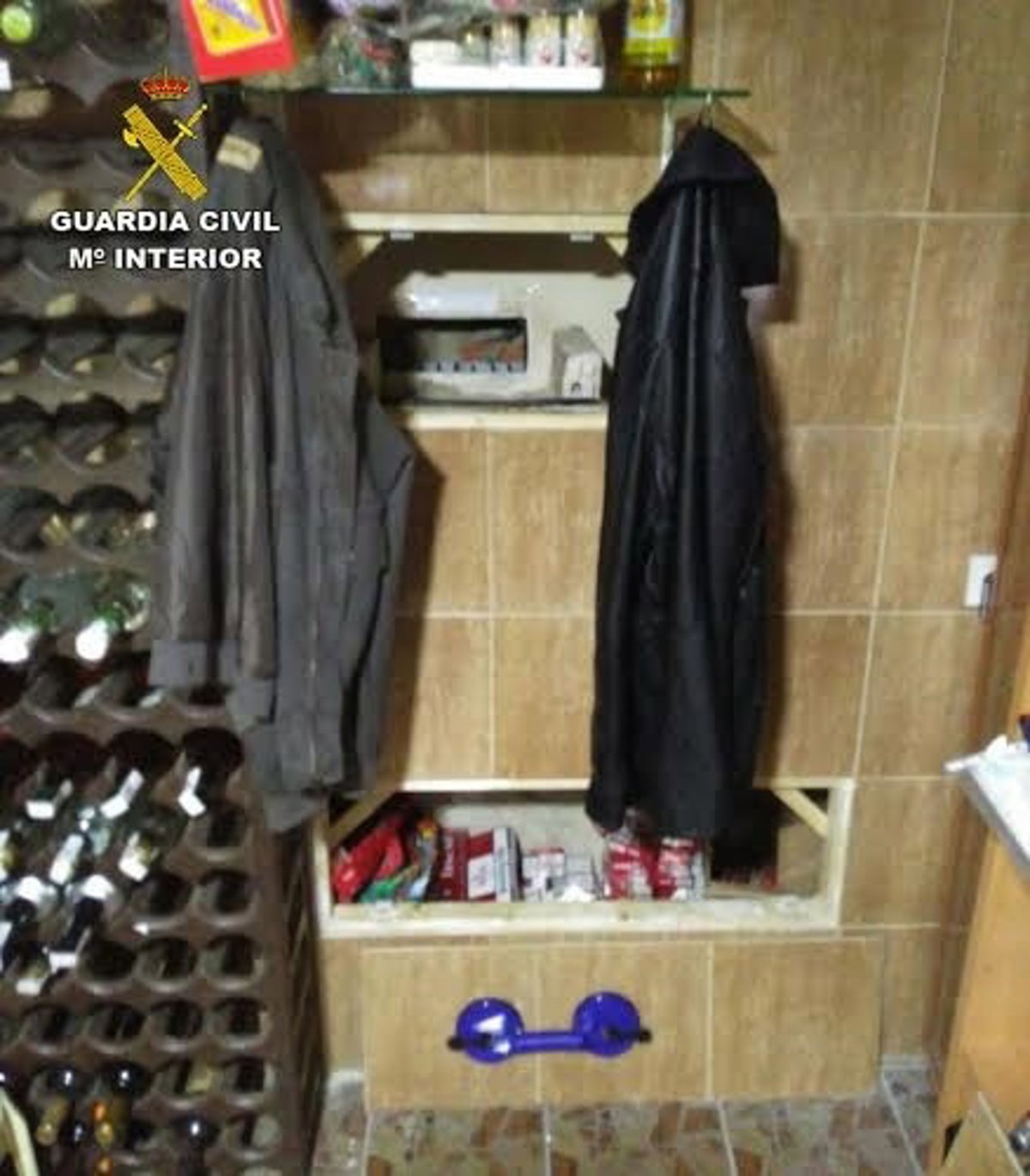Los agentes de la Guardia Civil tras el hallazgo accedieron a la zona trasera del local donde se encontraba el almacén del establecimiento, encontrando oculto entre el mobiliario otros dos huecos en el muro, supuestamente para rellenar los carriles y otro para almacenar tabaco.