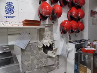 Posteriormente, se comprobó la existencia de un agujero en un cuarto de una de las paredes que separan este edificio de la pizzería y una manta colocada para amortiguar el ruido procedente de los cascotes, así como palanquetas, destornilladores, inhibidores de frecuencia y diversos útiles utilizados para perpetrar este tipo de acciones delictivas.
