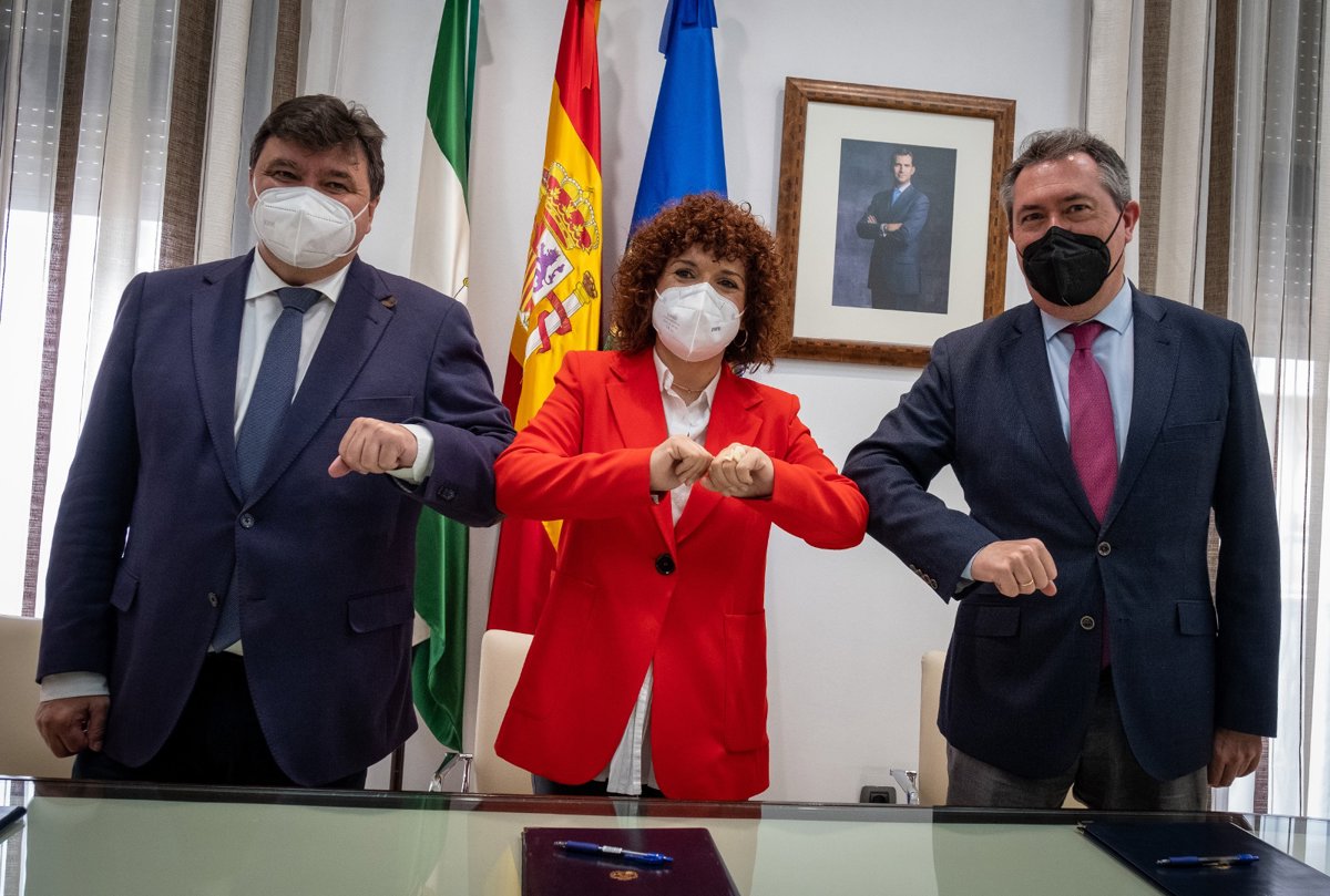 La presidenta de la Diputación de Huelva, María Eugenia Limón, el alcalde de Huelva, Gabriel Cruz, y el alcalde de Sevilla, Juan Espadas, --en calidad de presidente de Congresos y Turismo de Sevilla, Cotursa--, han firmado este viernes un convenio de colaboración con el objetivo de promocionar los sectores económicos de relevancia para la provincia de Huelva y las ciudades de Sevilla y Huelva.