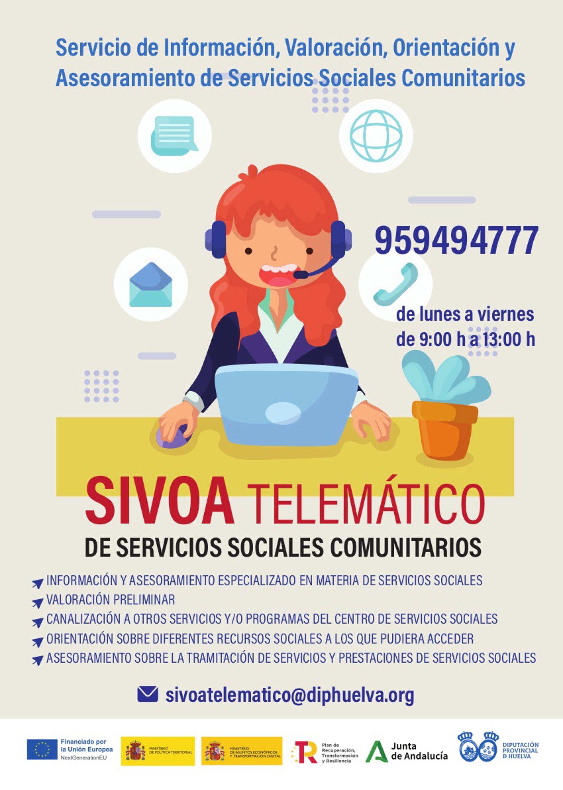 Cartel de la nueva modalidad telemática en la prestación del servicio de información, valoración, orientación y asesoramiento (Sivoa) de la Diputación de Huelva. - DIPUTACIÓN DE HUELVA