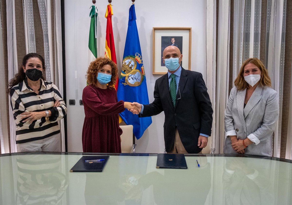 La presidenta de la Diputación de Huelva, María Eugenia Limón, y el responsable de relaciones corporativas de Cepsa en Andalucía y Canarias, Jesús Velasco, acompañados por la diputada de Presidencia, Belén Castillo, y la responsable de la Fundación Cepsa en Huelva, Teresa Millán, han rubricado el convenio de colaboración que va a hacer posible desarrollar actuaciones dirigidas a revitalizar y poner en valor el entorno de La Rábida como "pilar fundamental" de la identidad americanista de la provincia.
