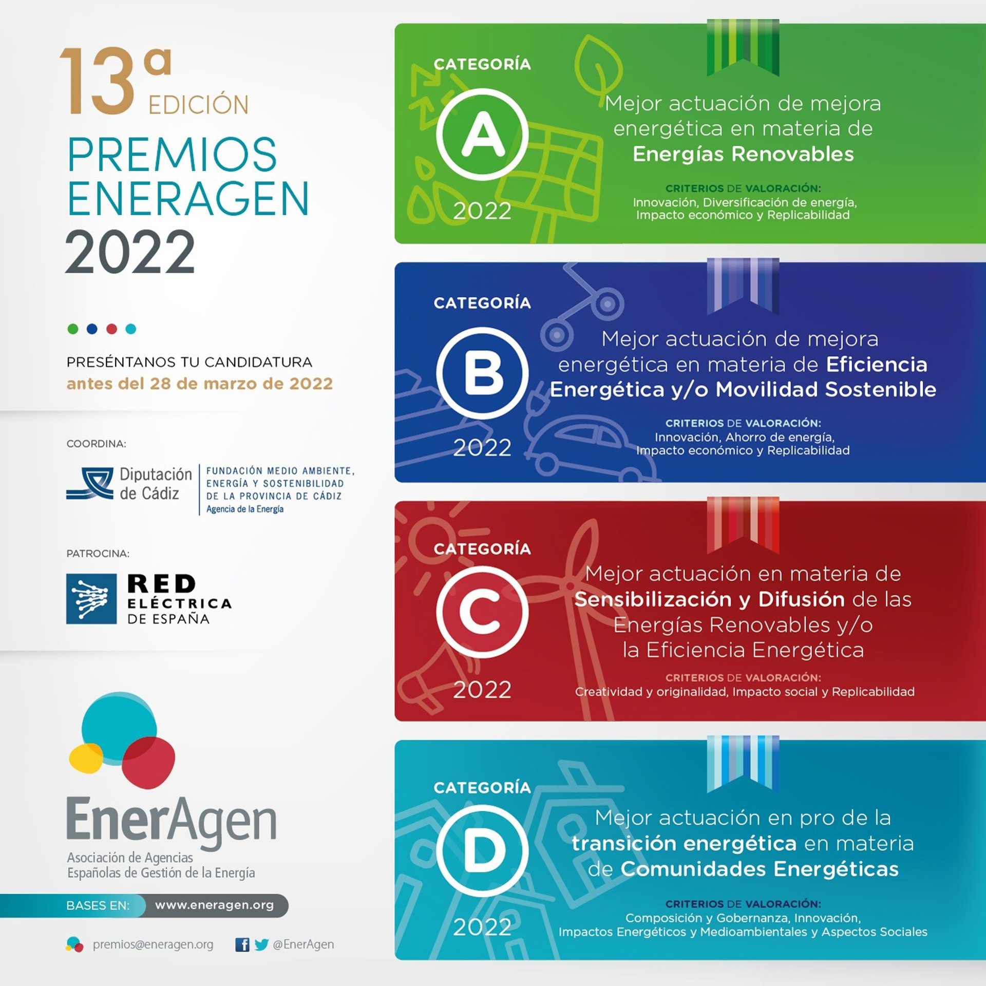 Para la edición de este año se convocan cuatro categorías, una más que otros años, ya que se incluye un nuevo galardón a la 'Mejor Actuación en Materia de Comunidades Energéticas', en "consonancia" con una de las líneas de trabajo "prioritarias" para los miembros de EnerAgen en la actualidad que, de hecho, han constituido un grupo de trabajo específico en esta materia.