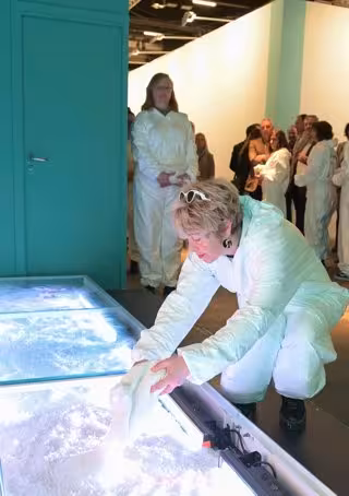 La inauguración oficial del stand ha contado con la realización de una performance titulada 'Yo soy tu biopoder trip' en la que diez mujeres, ataviadas con un mono blanco, --como símbolo de lo fluido, dinámico, femenino y dual--, con el título del proyecto serigrafiado en la espalda, han portado sacos de sal hasta llegar al espacio expositivo donde han depositado la sal a modo de ofrenda formando una simbólica montaña como metáfora del nuevo 'biopoder', de la construcción de un nuevo mundo más ecológico, sostenible, feminista, blanco, preservador y civilizado.