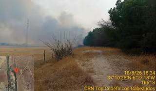 El Servicio de Extinción de Incendios Forestales de Andalucía, Plan Infoca, trabaja para sofocar un incendio declarado en la tarde de este lunes en el paraje Matalagrana, perteneciente al término municipal de Hinojos (Huelva).