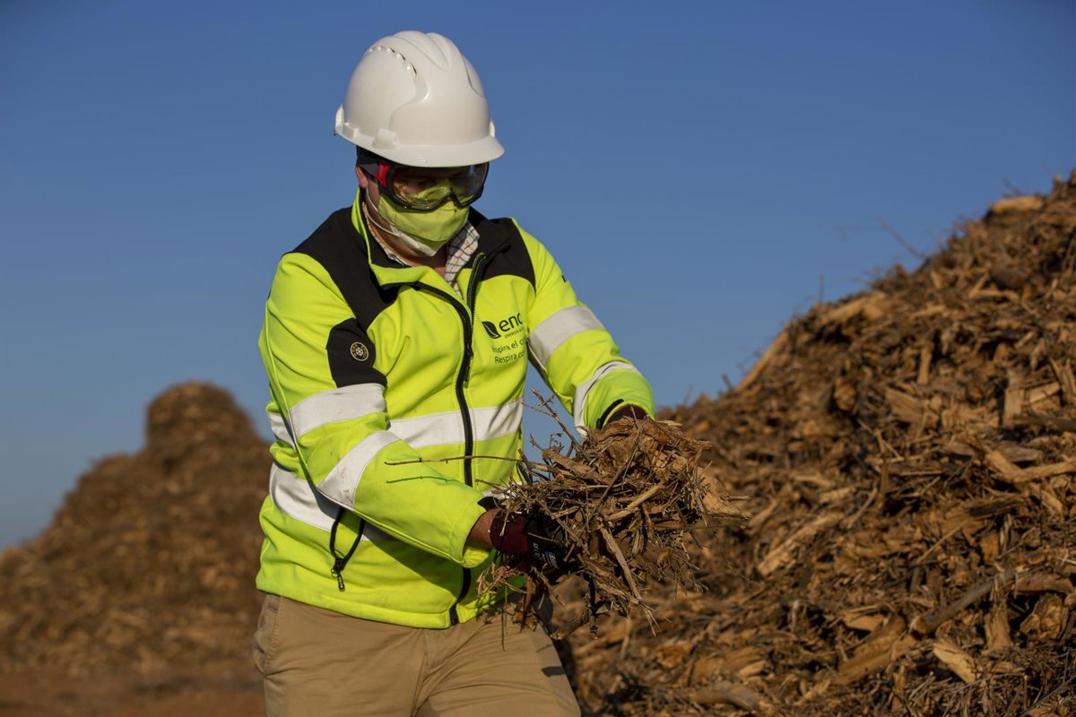 Archivo - Trabajador de Ence sosteniendo biomasa. - ENCE. - Archivo