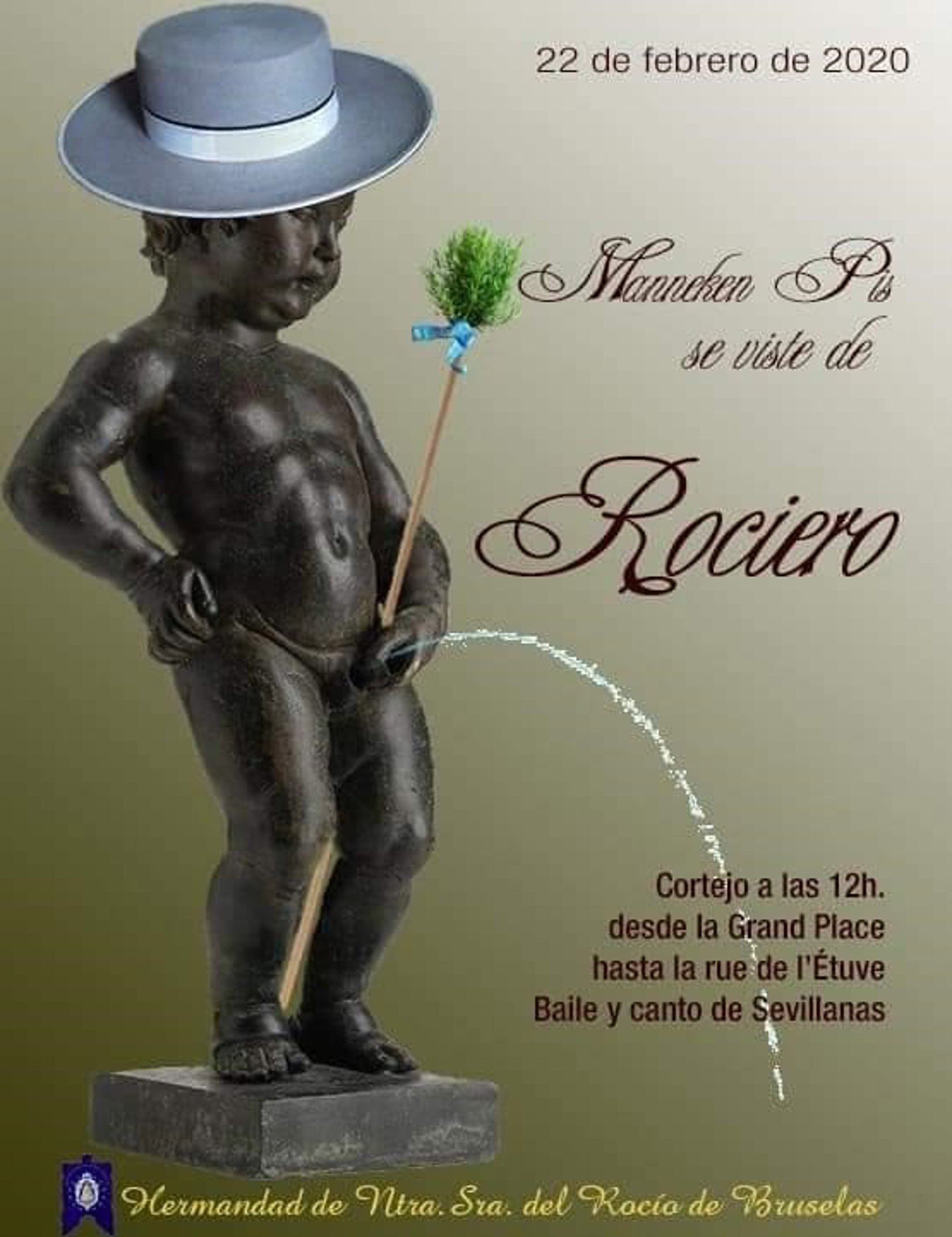 El próximo 22 de febrero, desde mediodía y hasta las 18,00 horas, el famoso y emblemático Manneken-Pis de Bruselas, conocido en España como el 'Niñito meón', se vestirá de rociero con motivo del XX aniversario del reconocimiento de la Hermandad del Rocío de Bruselas por la Hermandad Matriz de Almonte (Huelva).