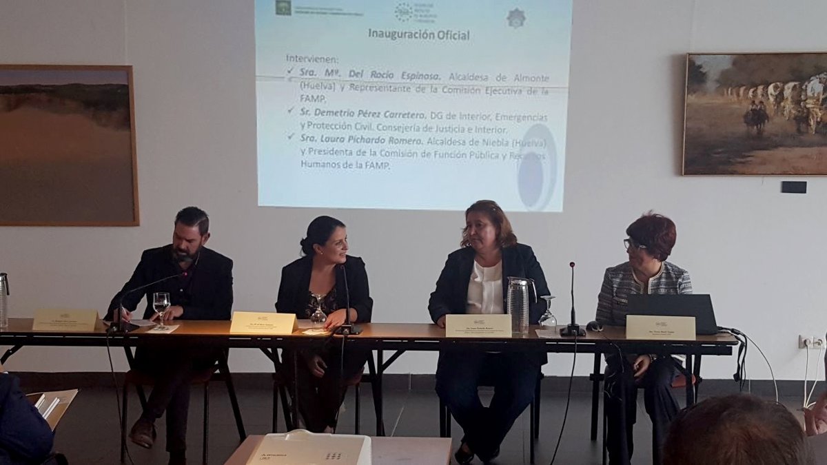 En la inauguración han estado presentes, María del Rocío Espinosa de la Torre, vocal de la Comisión Ejecutiva de la FAMP y alcaldesa de Almonte (Huelva); Demetrio Pérez Carretero, director general de Interior, Emergencias y Protección Civil, de la Consejería de Justicia e Interior de la Junta de Andalucía y Laura Pichardo Romero, presidenta de la Comisión de Función Pública y Recursos Humanos de la FAMP y alcaldesa de Niebla (Huelva).