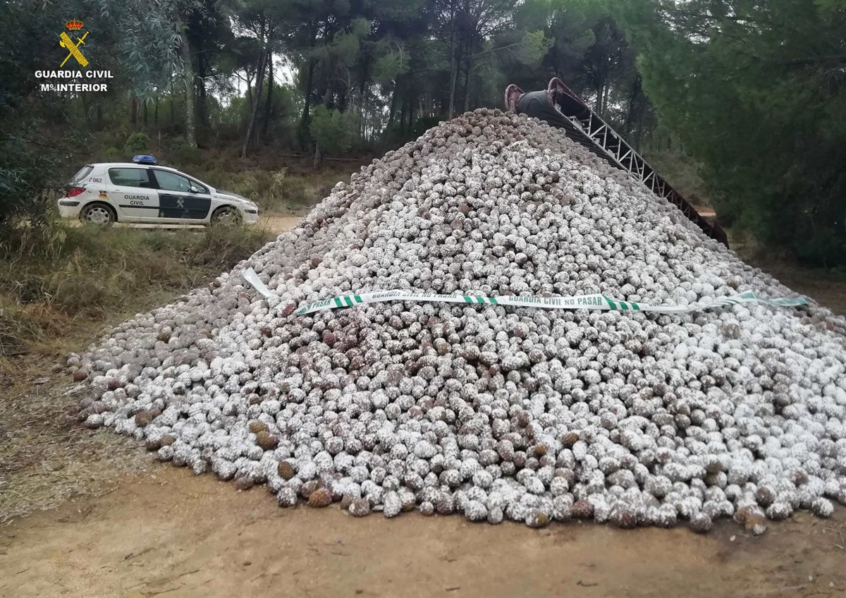 La Guardia Civil ha intervenido 25.500 kilos de piñas de pino piñonero en dos fincas de la provincia de Huelva, una de ellas entre Beas y Valverde del Camino, donde comprobaron que el lugar para el acopio de las piñas no era el autorizado y que excedían el máximo autorizado para esa empresa, y en el segundo de los casos, en Cabezas Rubias, se investiga además a tres personas por recoger piñas sin autorización para ello.