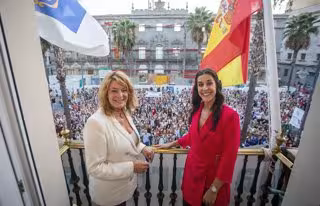 La alcaldesa de Huelva, Pilar Miranda (i) y la deportista Carolina Marín (d) posan en el balcón del Ayuntamiento con miles de onubenses a sus pies. - ALBERTO DÍAZ / AYUNTAMIENTO DE HUELVA