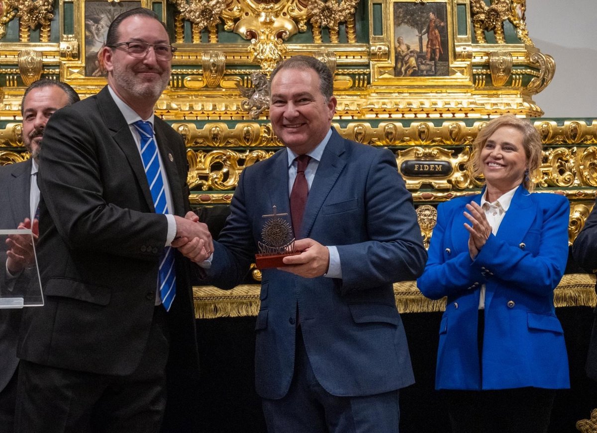El hermano mayor ha hecho entrega de un obsequio, el logo de la Cofradía, a los hermanos mayores presentes en el acto, al presidente de la Diputación, y a la concejala de Huelva Adela Mora.